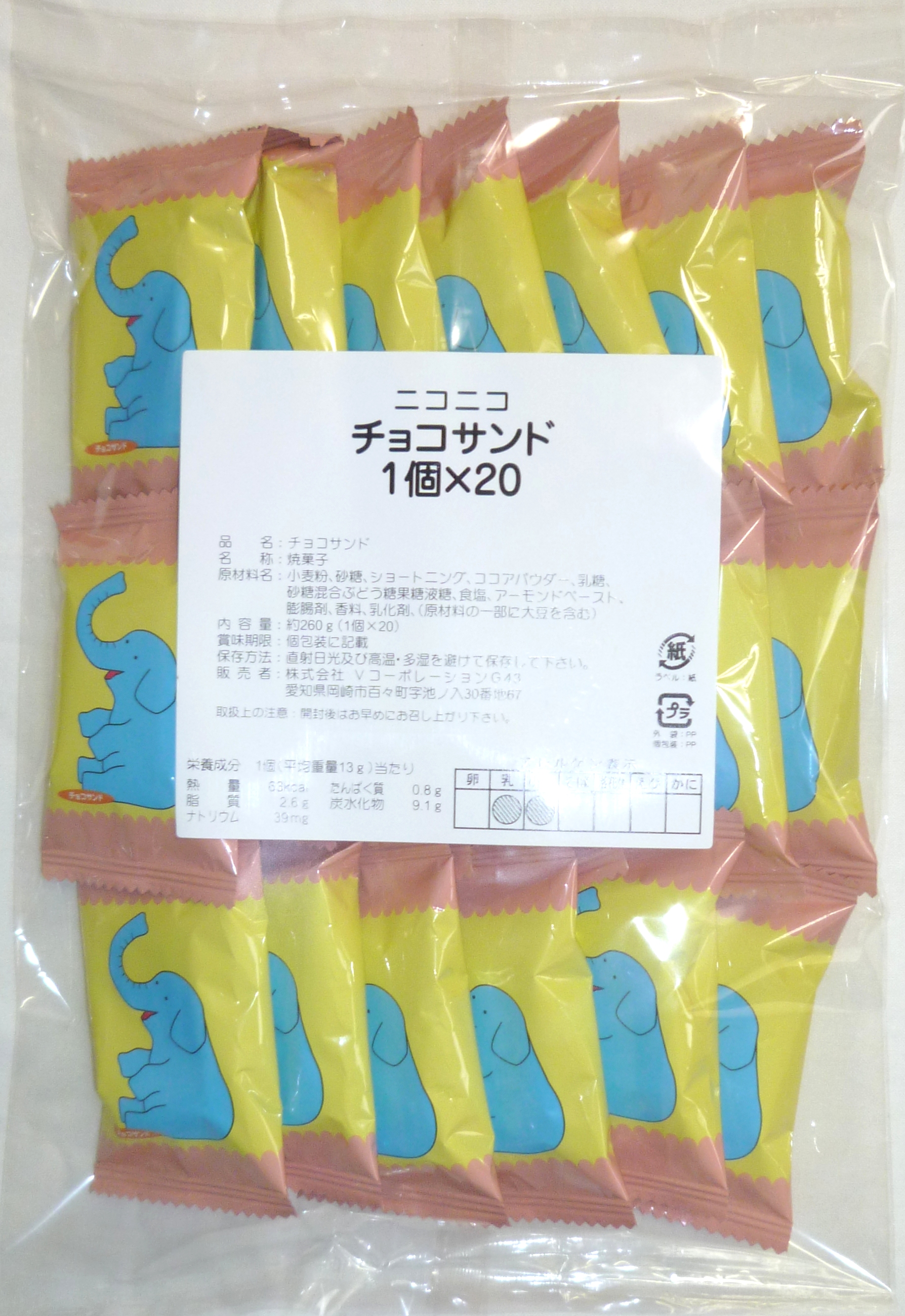 安全・安心・楽しい・おいしい! Vコーポレーションについて 商品紹介 商品紹介 Vコーポレーションを代表するロングセラー商品や、今だからこそ食べたい季節限定の商品をここではご紹介いたします。 ※都合により予告なく商品内容及び発売時期を変更する場合がございます。 ※写真はイメージです。商品内容と一部異なる場合がございます。 未分類 No.422チョコサンド ココア味のビスケットにカカオクリームがサンドされております。 821円(税込)760円(税別) 個装あり 原材料名 小麦粉(国内製造)、砂糖、ショートニング、ココアパウダー、乳糖、砂糖混合ぶどう糖果糖液糖、水あめ、食塩、アーモンドペースト/膨張剤、香料、乳化剤(大豆由来) 内容量 1個×20 ケース入り数 10袋 1袋当たりの価格 38円 賞味期間 300日 遺伝子組換情報 不分別 7大アレルゲン表示 小麦 乳 コンタミネーション 卵、落花生、オレンジ、バナナ、りんご、ごま << 前の「ブランクッキー」へ 次の「カルシウム入り ミルクビスケット」へ >> 新商品 カルシウム&鉄&DHAシリーズ おやつ袋 クッキー ビスケット&クラッカー ウエハース&焼菓子 ポン菓子 スナック お米のおかし ラスク&かりんとう お芋のおかし ラムネ&乳児向け菓子 半生菓子 大袋 ゼリー&茶 副食品&食材&珍味 季節の商品 季節行事のご案内